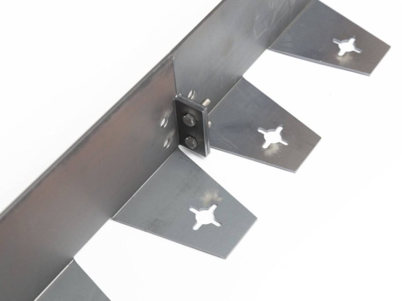 Jednotlivé obrubníky se spojují pomocí šroubu a matice, které je nutné dokoupit samostatně. Díky tomuto systému spojování je montáž snadná, pevná a umožňuje vytvářet libovolné tvary a linie. Pro přikotvení do země je třeba použít originální kovové hřeby.